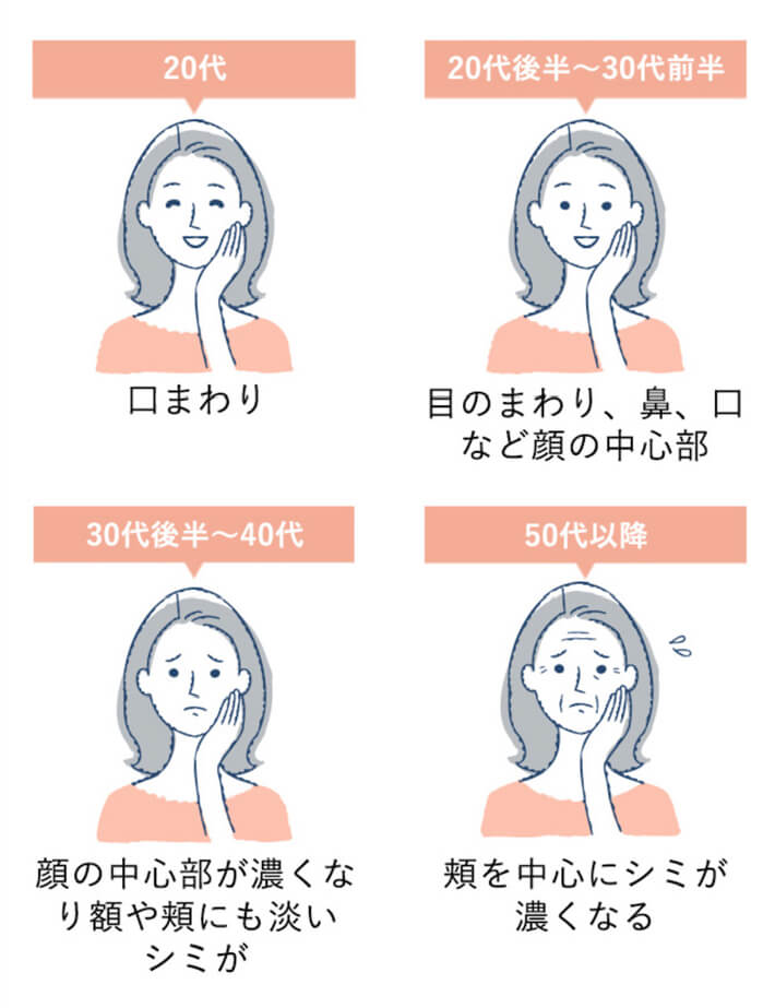 ただ一括りにシミといっても年代によりできやすい部分も違ってきます。