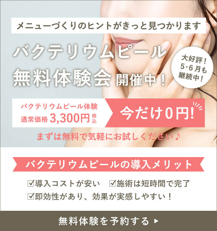 低コスト・シンプルな施術で、導入しやすさが魅力のバクテリウムピールを今回サロン関係者さま限定で無料体験いただける機会をご用意しました。